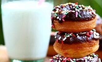 Пончик — это круглый пирожок с дыркой по центру, обжаренный в масле. Но в сегодняшнем рецепте мы будем пончики выпекать в духовке. В молоко высыпать дрожжи и сахар....